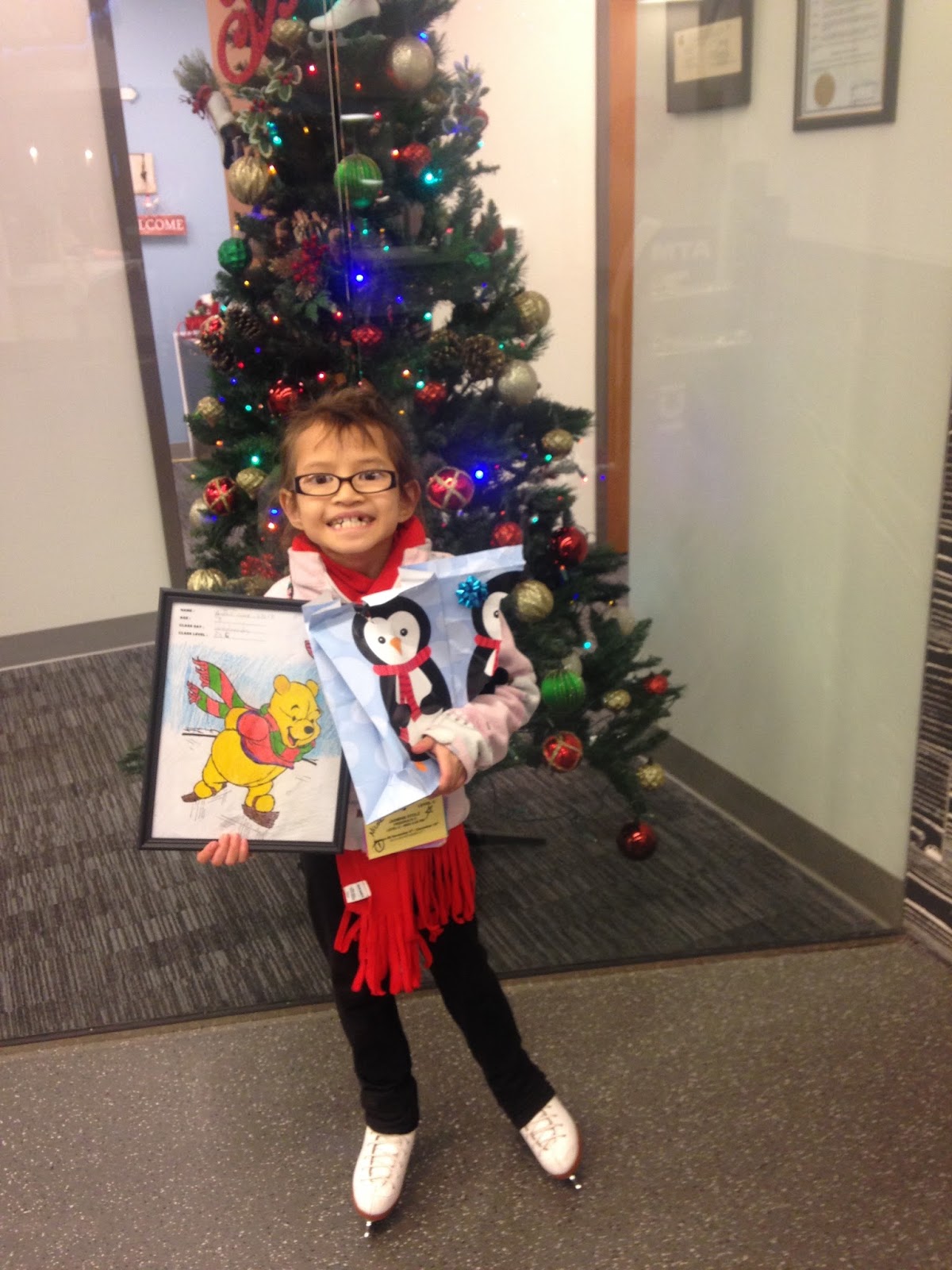 Jazzy won the coloring contest for all categories and age groups of Learn to Skate! She won a pair of US Figure Skating Gloves, USFS tee shirt and stickers, candy, hot chocolate, skate note pad, pen, Christmas pencils and another autographed photo of Gracie Gold :)